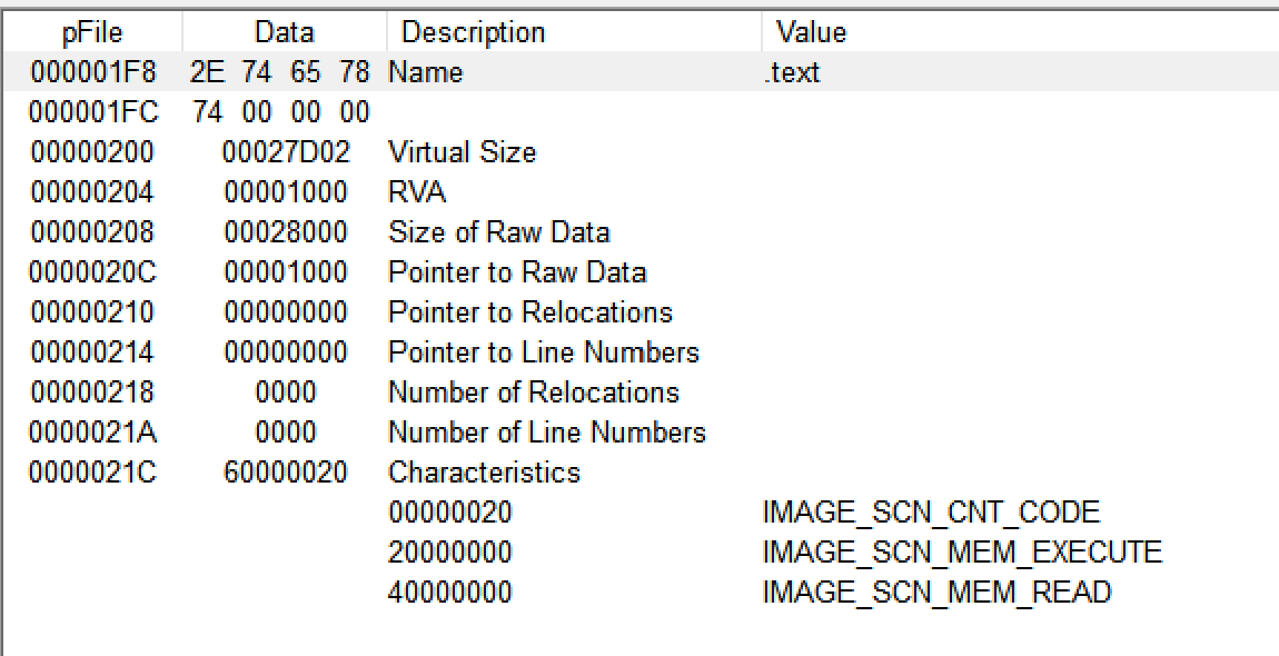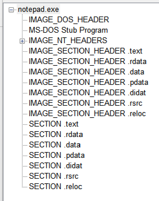 notepad.exe에는 위와 같은 섹션이 존재한다. 중요한 code, data 영역 헤더를 살펴보자