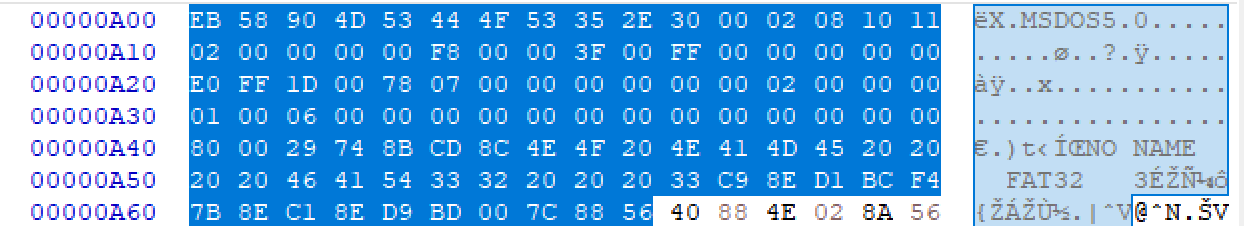 일단 55 AA 보이는 곳중에서 가장 내용이 많고 그럴싸한(?) 곳이다. MSDOS5인 것을 보아 구조가 맞는 거 같은데...